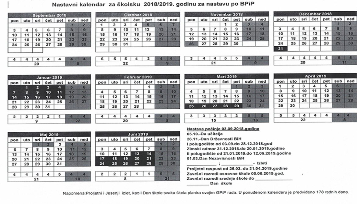 Ovim kalendarom propisuje se trajanje nastavne godine, odnosno početak i završetak nastave, broj i trajanje obrazovnih perioda, trajanje učeničkih odmora i broj radnih dana u osnovnim i srednjim školama za školsku godinu 2018./2019.