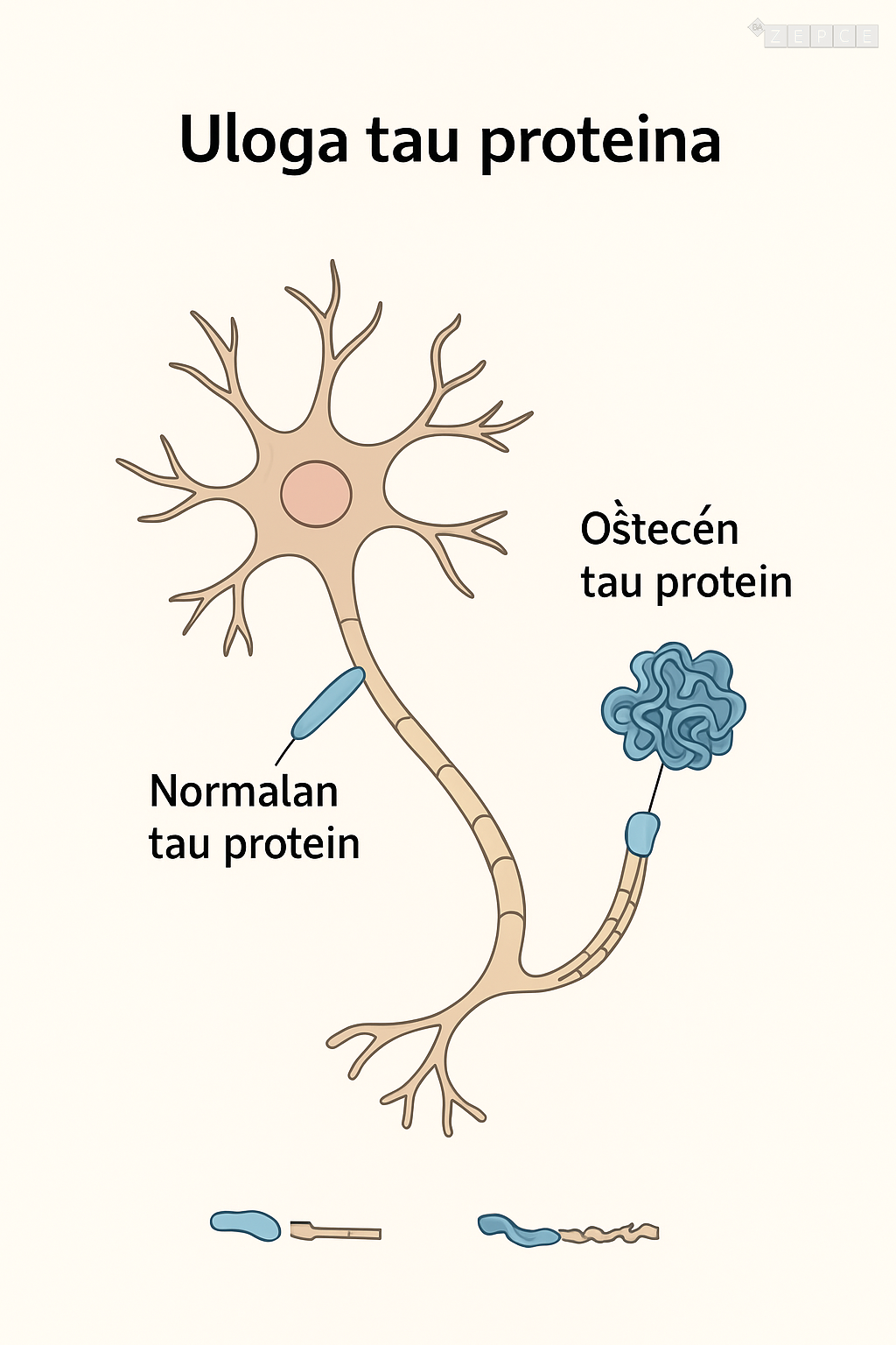 Kada je tau protein u normalnom stanju, on održava neuronsku mrežu stabilnom i funkcionalnom. Problem nastaje kada dođe do njegovih abnormalnih hemijskih modifikacija, prije svega hiperfosforilacije – procesa u kojem se za protein veže previše fosfatnih grupa ( slika 1 ). U normalnim okolnostima uloga tau proteina je zaštitna i stabilizirajuća, dok poremećaji u njegovoj strukturi i funkciji pokreću niz procesa koji dovode do propadanja moždanih ćelija.