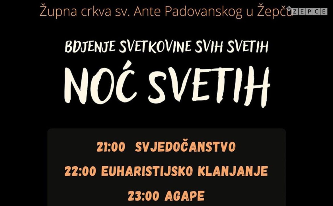 U ponedjeljak , 31. 10. 2022. godine, uoči svetkovine Svih svetih, u crkvi Sv. Ante Padovanskog bit će upriličeno bdijenje Noć svetih.