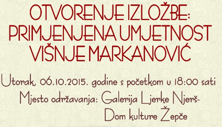 U okviru programa obilježavanja 14.10., Dana općine Žepče u utorak, 6.10.2015. godine sa početkom u 18,00 sati, u Galeriji Ljerke Njerš bit će upriličena izložba pod nazivom “Primijenjena umjetnost Višnje Markanović “.