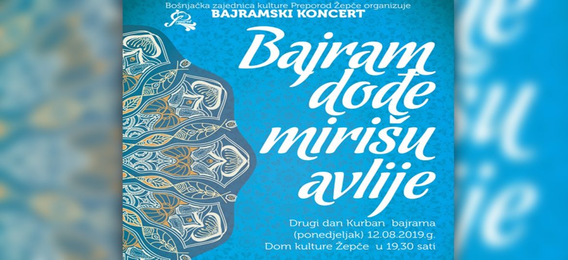 U povodu Kurban-bajrama Bošnjačka zajednica kulture „Preporod“ Žepče organizuje bajramski koncert pod nazivom „Bajram dođe,mirišu avlije„. Cjelovečerni muzičko-zabavni program izvest će gosti: Ansambl pjesama i igara, Mješoviti hor, te narodni i tamburaški orkestar Bošnjačke zajednice kulture „Preporod „Brčko.