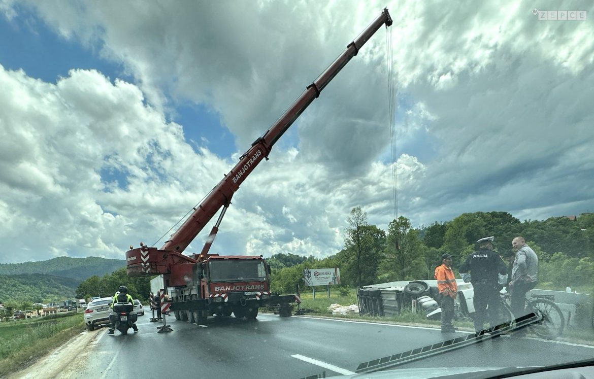 Saobraćaj se odvija jednom trakom naizmjenično zbog izvlačenja prevrnutog teretnog motornog vozila pored kolovoza.